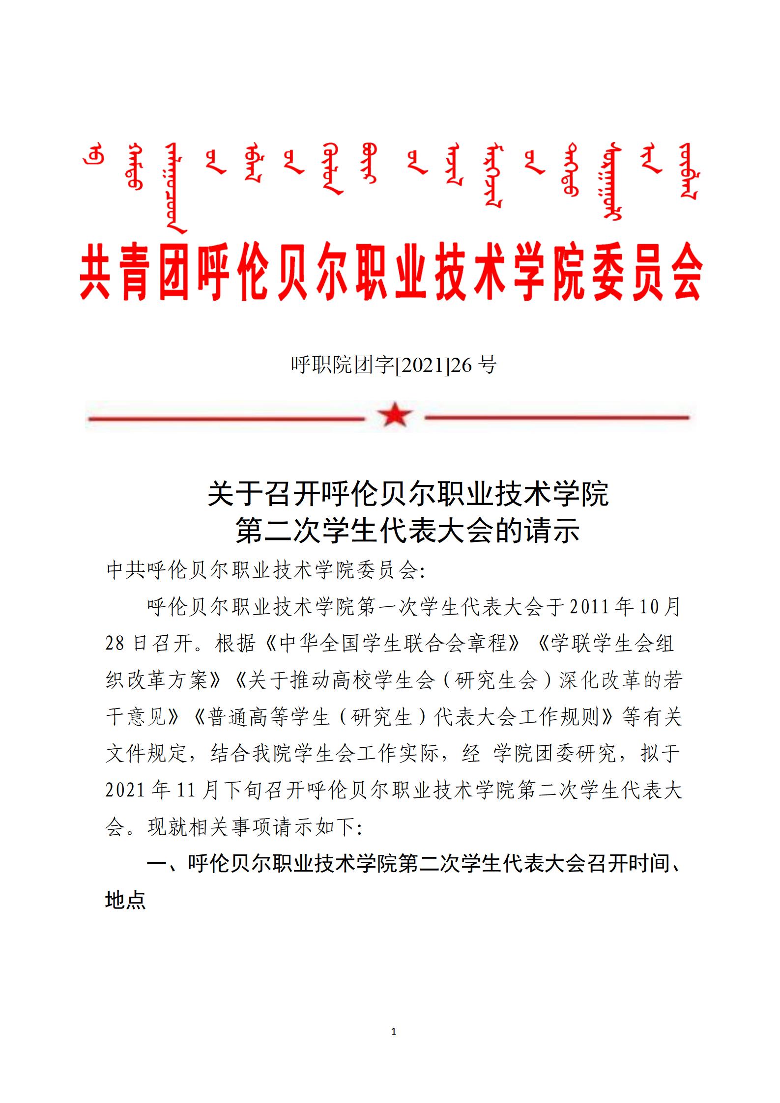 26号 关于召开呼伦贝尔职业技术学院 第二次学生代表大会的请示
