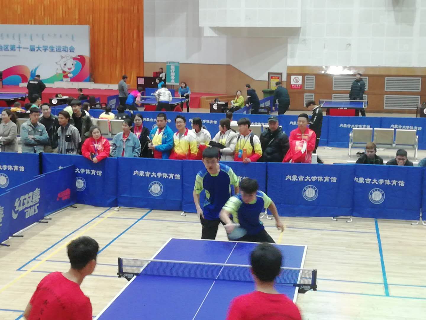 内蒙古自治区第十一届大学生运动会乒乓球比赛于3月20日在内蒙古大学举行,经过激励角逐,我院荣获体育道德风尚奖,乒乓球队荣获高职高专组男子团体第八名、男子双打第五名、女子双打第六名。宋勇老师荣获优秀教练员,乔英男、李瀚林荣获优秀运动员。